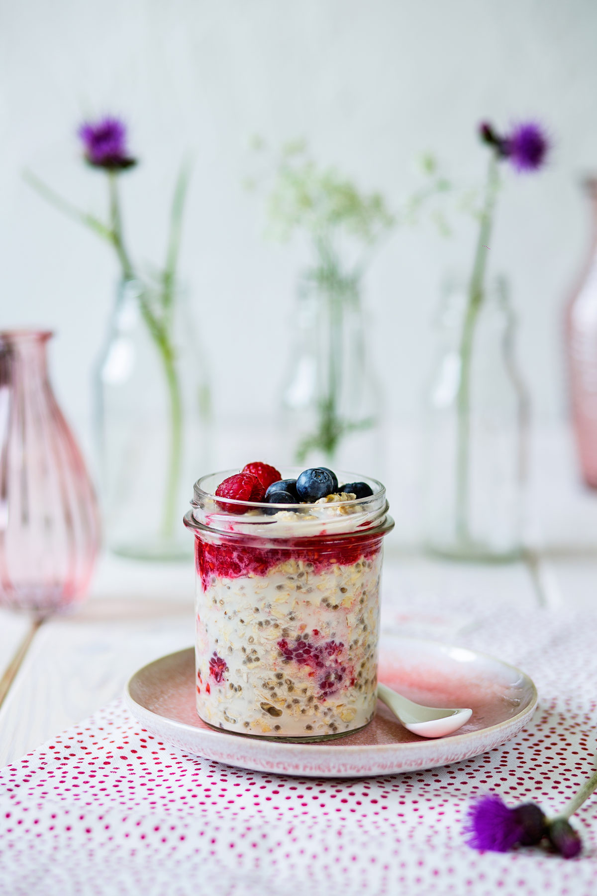 Mus malinowy przygotowujemy zgniatając owoce widelcem. Układamy na wierzchu owsianki i posypujemy ulubionymi owocami.