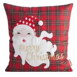 Poszewka świąteczna 45x45 cm – w kratę z haftem Mikołaja