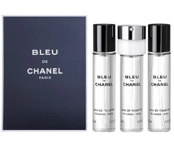 Zestaw Chanel Bleu de Chanel Pour Homme składający się z wody toaletowej z atomizerem o pojemności 20ml oraz dwóch wkładów o pojemności 20ml