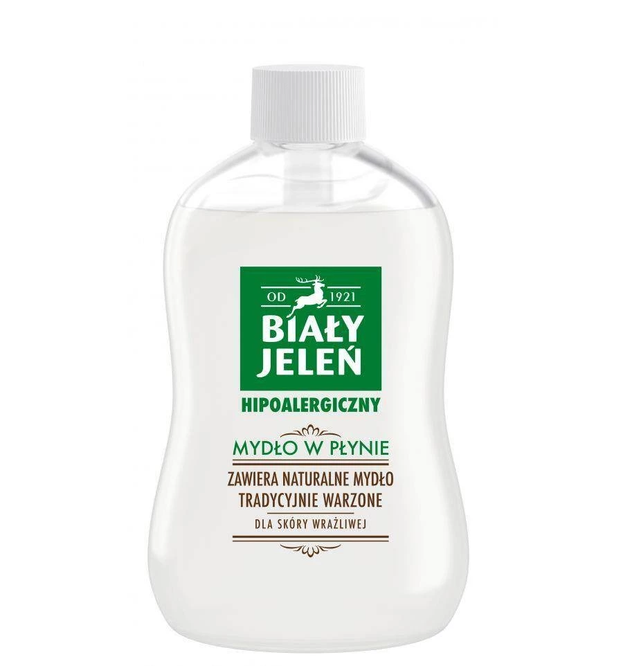 Biały Jeleń hipoalergiczne mydło w płynie przeznaczone do codziennej pielęgnacji skóry wrażliwej skłonnej do alergii. Łagodnie myje i oczyszcza skórę, nie podrażniając i nie wysuszając jej. Starannie opracowana formuła z naturalnymi składnikami sprawia, że skóra jest miękka i jedwabiście gładka.