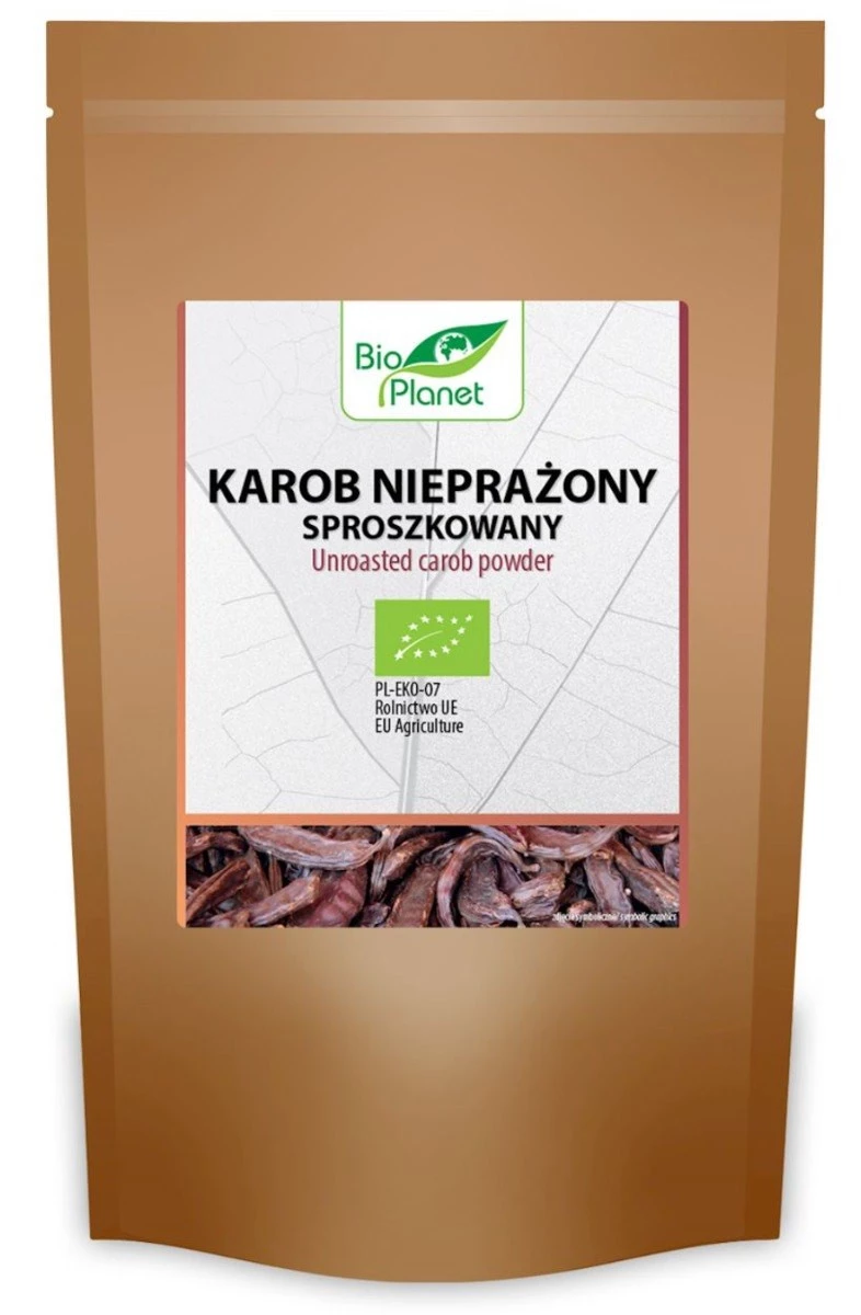 • BIO PLANET Karob BIO 200 g. Ekologiczny karob to pozbawione nasion i zmielone strąki drzewa karobowego, zwanego szarańczynem strąkowym.