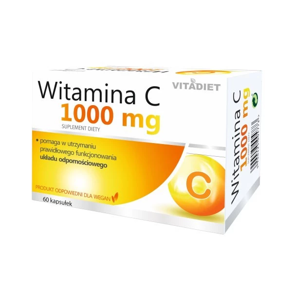 Produkt Vitadiet Witamina C na odporność 1000Mg 60 kaps. VITADIET to suplement diety. Nie może być stosowany jako substytut zróżnicowanej diety. Pamiętaj o zrównoważonym sposobie żywienia i zdrowym trybie życia.- Przechowuj w chłodnym miejscu, z dala od bezpośredniego światła słonecznego.