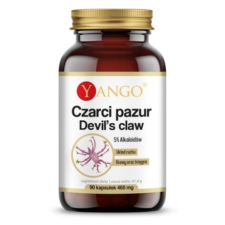 Suplement diety Yango Czarci pazur 90 kapsułek to wysokiej jakości produkt, który stanowi źródło cennego ekstraktu z czarciego pazura, inaczej hakorośli rozesłanej. Wyciąg z Harpagophytum procumbens standaryzowany jest na zawartość 5% alkaloidów. Preparat ten ma wygodną do stosowania postać kapsułek. Jego zaletą jest również czysty i naturalny skład.
