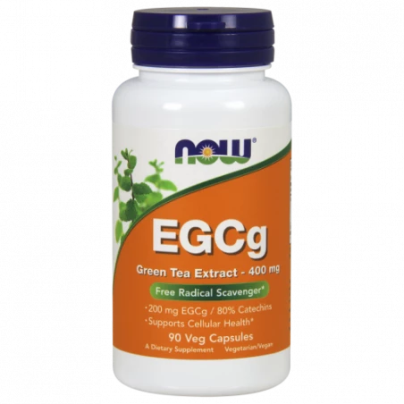 Suplement diety Now Foods Green Tea Extract EGCg zawiera 400 mg ekstraktu z liści zielonej herbaty standaryzowanego na zawartość 98% polifenoli, 80% katechin oraz 50% EGCg. Zawiera bardzo dużą ilość składników aktywnych, równających się ilości 4 filiżankom zielonej herbaty. Preparat jest wolny od jakichkolwiek sztucznych dodatków czy konserwantów. Nie zawiera GMO i jest odpowiedni dla wegan.