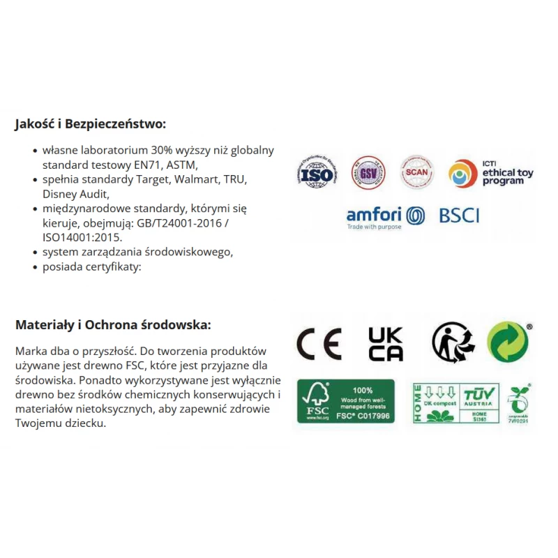 Drewniane zabawki produkowane są zwykle z drewna pozyskiwanego w sposób zrównoważony, co czyni je bardziej przyjazną opcją niż ich plastikowe odpowiedniki. Drewno podlega recyklingowi, biodegradacji i jest substancją odnawialną. Ponadto może być barwione przy użyciu nietoksycznych pigmentów. Z uwagi na hipoalergiczność i posiadane atesty produkty marki Classic World stanowią świetny pomysł na prezent dla dzieci z okazji ich urodzin, ale nie tylko.