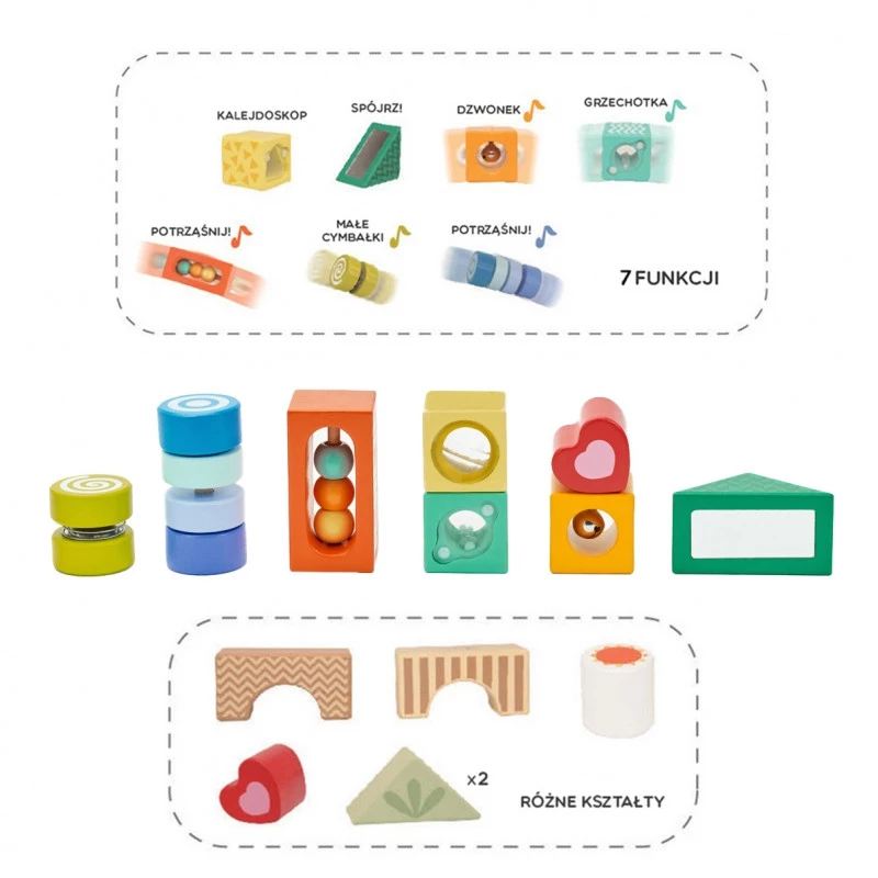 Classic World − Drewniane klocki sensoryczne 8 funkcji, układanka multifunkcyjna kształty dźwięk 18 el.