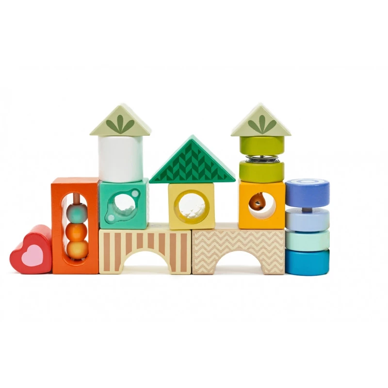 Klocki to klasyczne zabawki skutecznie rozwijające intelekt dziecka. Zapewniają zabawę wpływając pozytywnie na wyobraźnię malucha. Zestaw ten został stworzony do stymulowania zmysłów, różnymi kolorami, wzorami i powierzchniami klocków, by zaintrygować i zaspokoić ciekawość małych dłoni. Dla łatwego przechowania, klocki zostały umieszczone w drewnianej ramce by bezpiecznie czekały na następną lekcję przez zabawę.