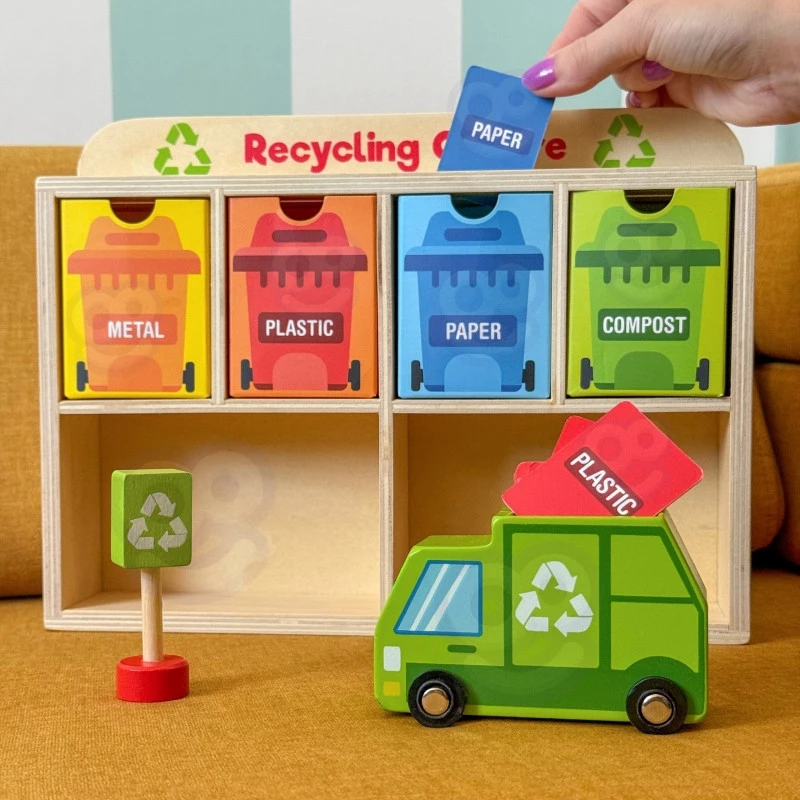 Zróbmy co w naszej mocy, aby ocalić nasza planetę! Warto od najmłodszych lat uczyć dzieci dobrych nawyków, dlatego odkryj świat sortowania śmieci z Centrum Recyklingu od marki Tooky Toy. Zabawa polega na sortowaniu śmieci, za pomocą kart, na których narysowane są odpady wykonane z różnych materiałów. Kartę z obrazkiem wrzucamy do śmieciarki, następnie do maszyny sortującej i na końcu do odpowiedniego kontenera umieszczonego na specjalnej, drewnianej szafce, według tego z jakiego materiału przedmiot na obrazku jest wykonany.