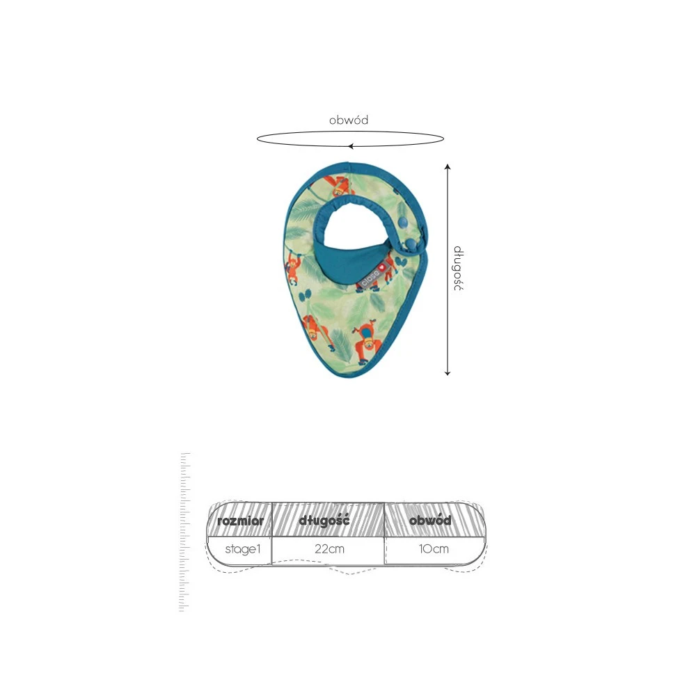 - Dwustronny śliniaczek przeznaczony jest dla maluszka już od pierwszych chwil życia. Dwustopniowa regulacja obwodu szyi pozwala łatwo dopasować śliniak do rosnącego dziecka.