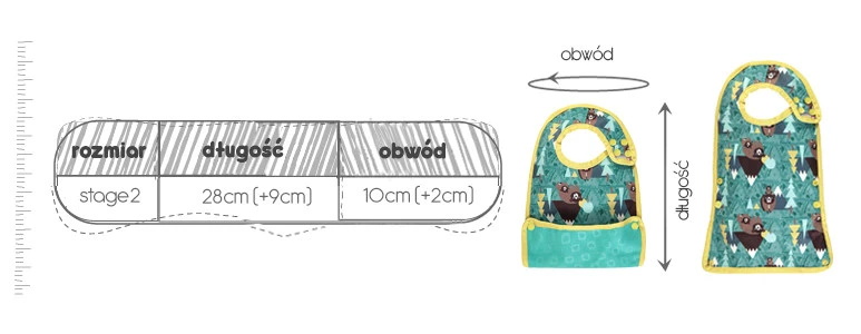 Dla komfortu dziecka i opiekuna zapięcie śliniaka umieszczono z boku. Napy pozwalają dopasować obwód do szyi dziecka.