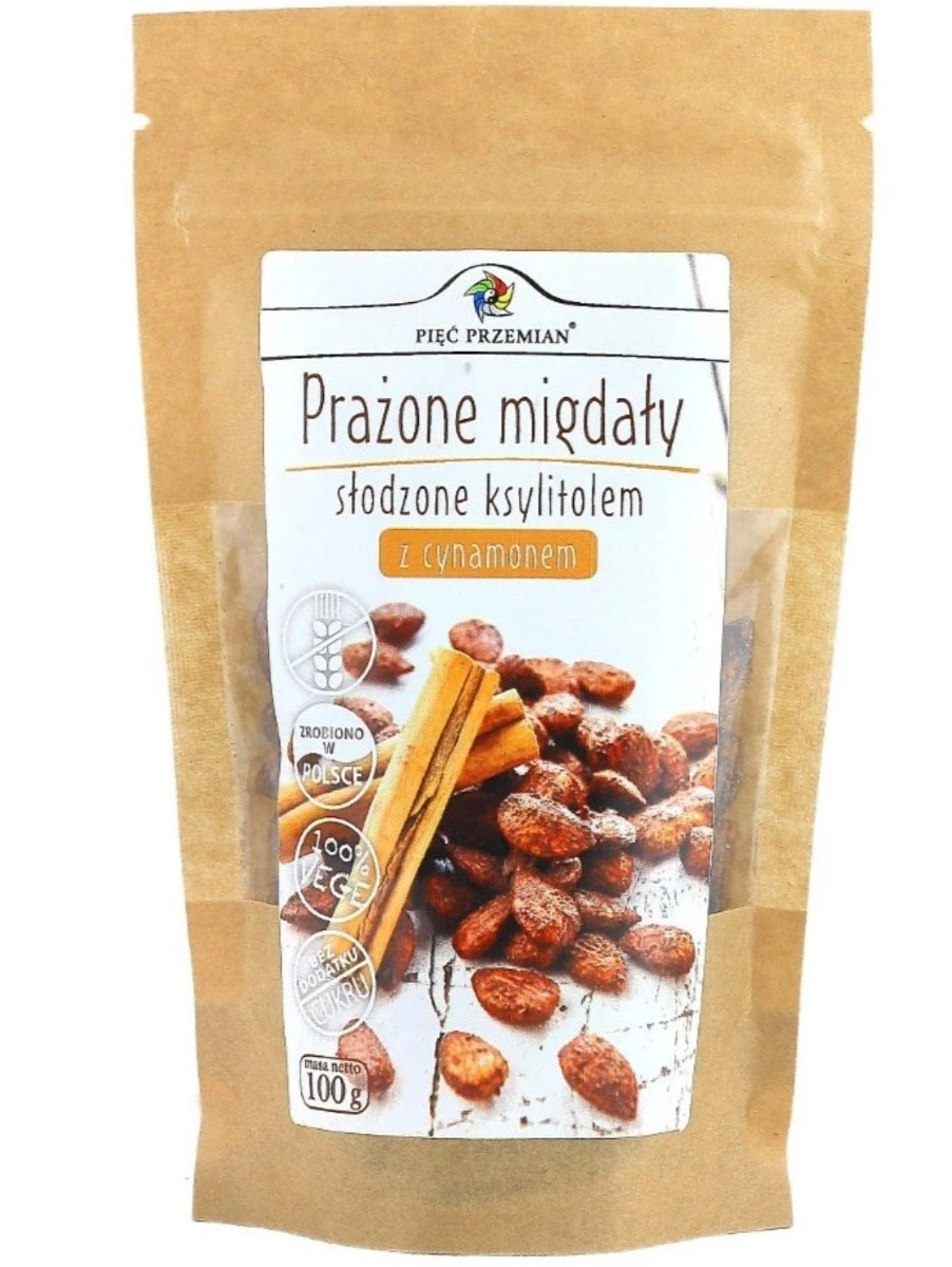 Składniki: migdały 87%, ksylitol (substancja słodząca) 10% (Finlandia), cynamon 1,8% (Cejlon), sól kłodawska, kardamon, naturalny aromat pomarańczowy.