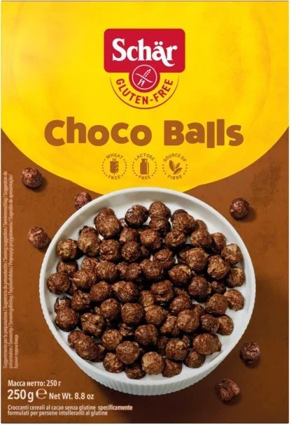 Schar, Choco balls, chrupki kakaowe bezgl. (250 g) to propozycja dla wielbicieli słodkich śniadań. Chrupiące kakaowe kulki pozwolą Ci dobrze rozpocząć dzień. Chrupki kakaowe bezgl. to prosty i szybki sposób na wartościowy posiłek. Chrupki kakaowe bezgl. Schar możesz podawać z mlekiem, jogurtem lub napojem roślinnym.