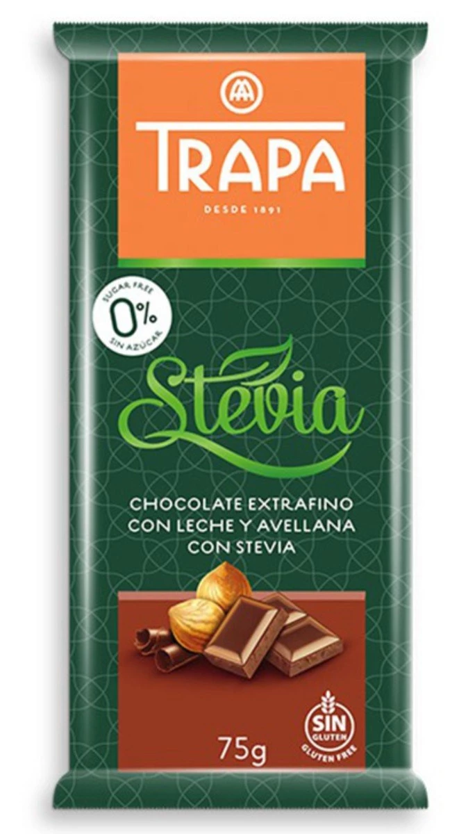 TRAPA Czekolada mleczna z orzechami laskowymi ze stewią 75 g to połączenie kremowej mlecznej czekolady z chrupiącymi kawałkami orzechów laskowych. Dostarcza ona delikatnej słodyczy, którą uzyskano dzięki stewii. Dzięki temu doskonale sprawdzi się ona w przypadku osób unikających cukru w swojej diecie.