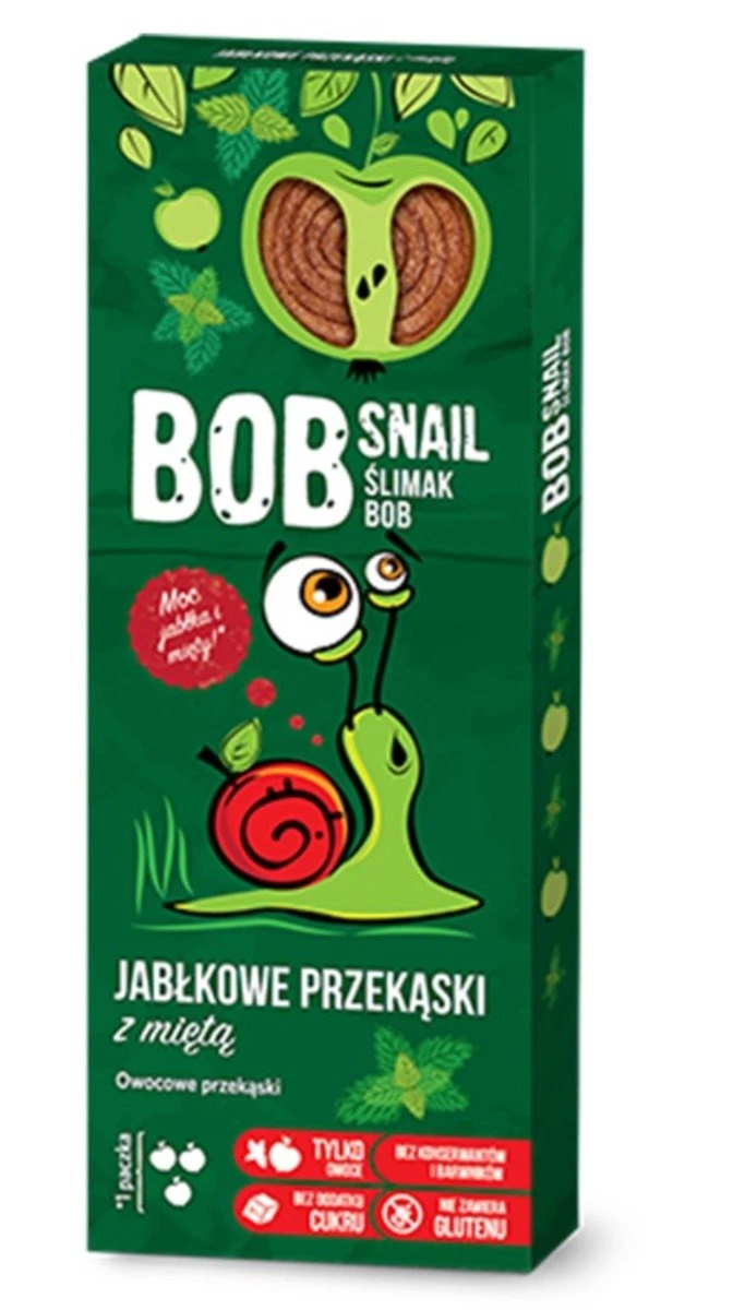 BOB SNAIL Przekąska jabłko mięta 30 g to nietuzinkowe połączenie słodyczy soczystego jabłka z orzeźwiającym akcentem mięty. Dzięki tej kompozycji smaków przekąska wyróżnia się delikatnym, owocowym aromatem, któremu towarzyszy subtelna, miętowa nuta. Całość przyciąga uwagę swoją prostotą i naturalnym składem.