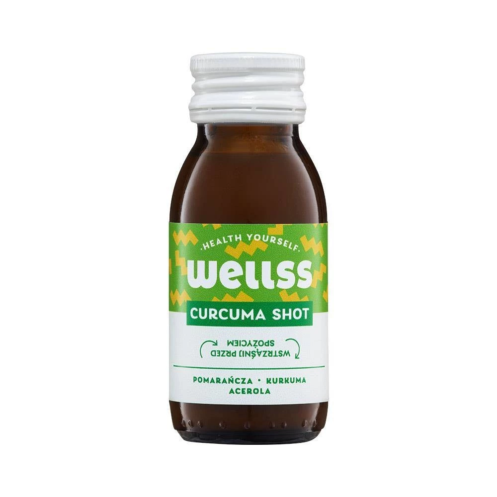 - Wellss Shots to doskonały zastrzyk witamin i wartości odżywczych dla organizmu. W butelce Curcuma Shot Odporność znajdują się składniki pochodzenia naturalnego takie jak soki z pomarańczy jabłek, cytryn i imbiru oraz kurkuma, acerola i pieprz.
