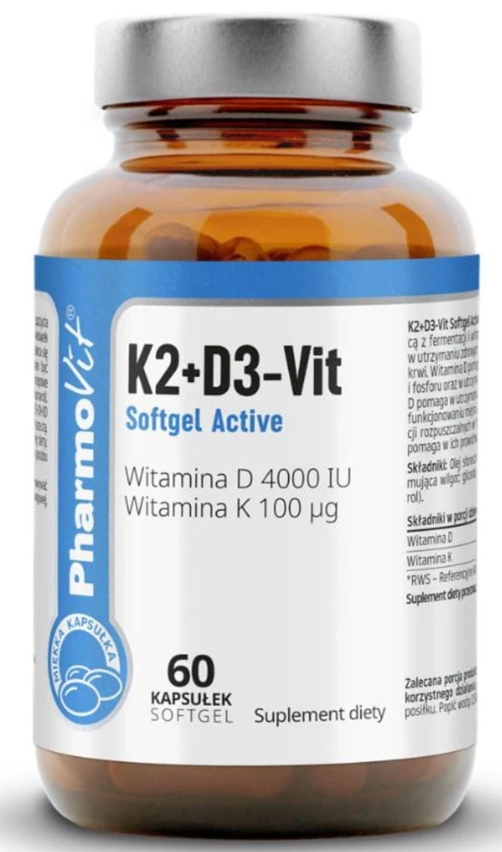 Pharmovit K2+D3-Vit Softgel Active 60 kapsułek to suplement diety łączący dwie witaminy – K2 i D3 – w jednej kapsułce. Witamina K występuje w postaci menachinonu, natomiast witamina D pochodzi z lanoliny. Witaminy są zamknięte w miękkich kapsułkach typu softgel, co ułatwia ich stosowanie.