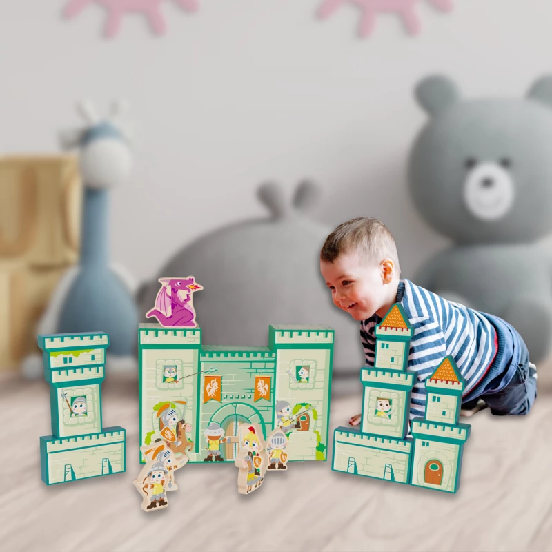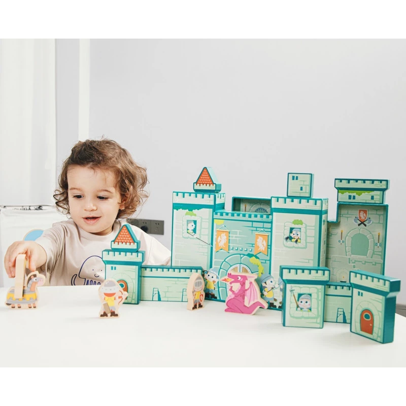 Makieta Zamek Smok od renomowanej marki Classic World to idealny zestaw dla Wielkich Wojowników, którzy odważnie będą walczyć ze smokiem. Zestaw zawiera 16 drewnianych elementów Dziecko będzie mogło bawić się klockami i budować zamek, aby obronić miasto przed złym smokiem. Za pomocą wyobraźni dzieci mogą opowiadać własne historie o swoich dzielnych czynach. Produkt świetny do zabawy w grupie.