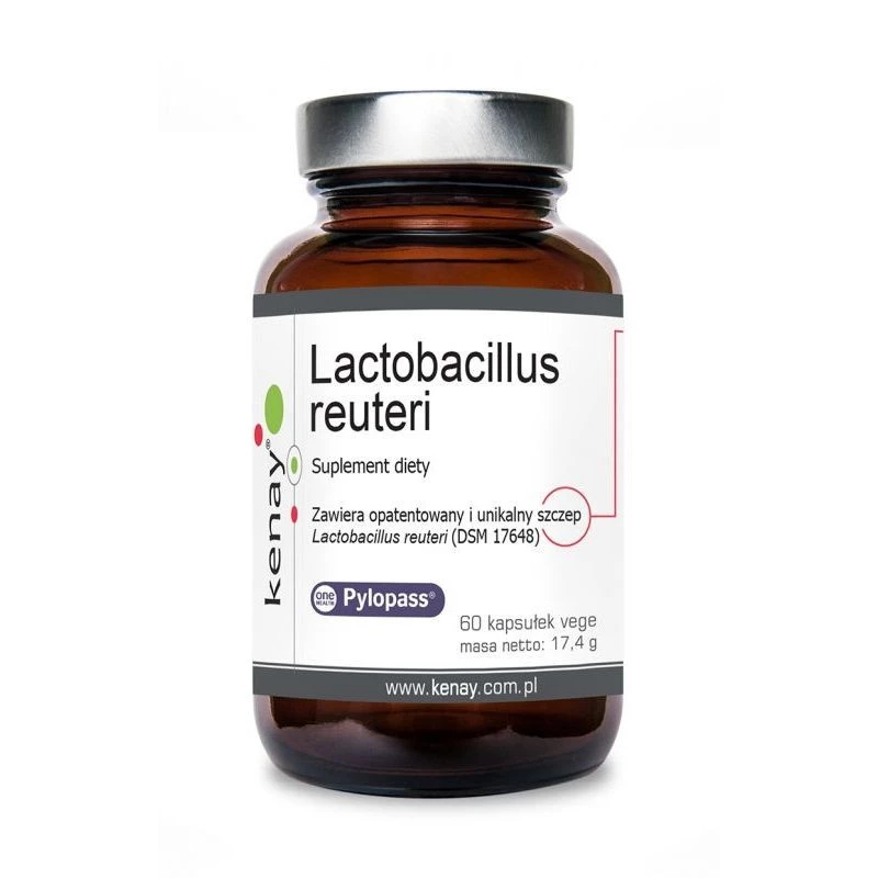 Suplement diety Kenay Lactobacillus reuteri Pylopass® 60 kapsułek to wysokiej jakości produkt, który zawiera szczepy bakterii probiotycznych z gatunku Lactobacillus. Ma on formę wegańskich kapsułek. Pylopass® wytrzymuje niskie pH w żołądku wykorzystując odpowiedni mechanizm przetrwania, któremu nie szkodzi kwas solny. Nie wymaga kontrolowanej temperatury w transporcie i przechowywaniu.