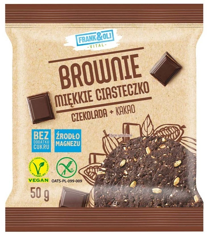 Frank&Oli Ciastko Miękkie Brownie z Czekoladą i Kakao 50 g to świetna przekąska dostarczająca dużej ilości błonnika pokarmowego, dzięki zawartości płatków owsianych, czekolady, pasty orzechowej, miąższu z orzechów kokosa i korzenia cykorii.