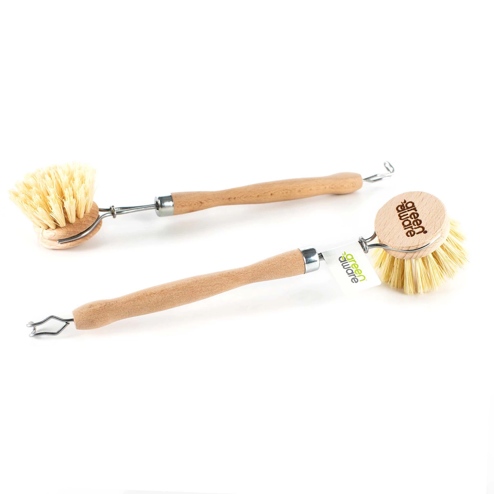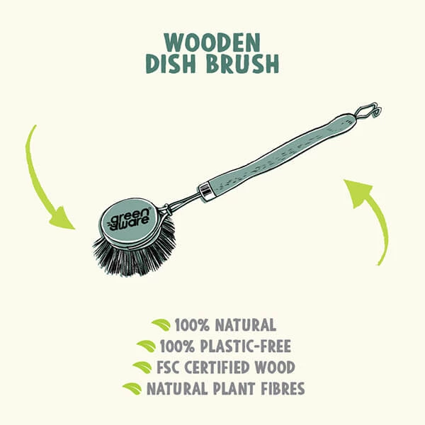 - Drewniana szczotka do mycia naczyń jest alternatywą dla plastikowych gąbek, myjek, skrobaków. Wykonana z drewna pochodzącego z certyfikowanych źródeł (FSC) oraz z roślinnego włókna z agawy.