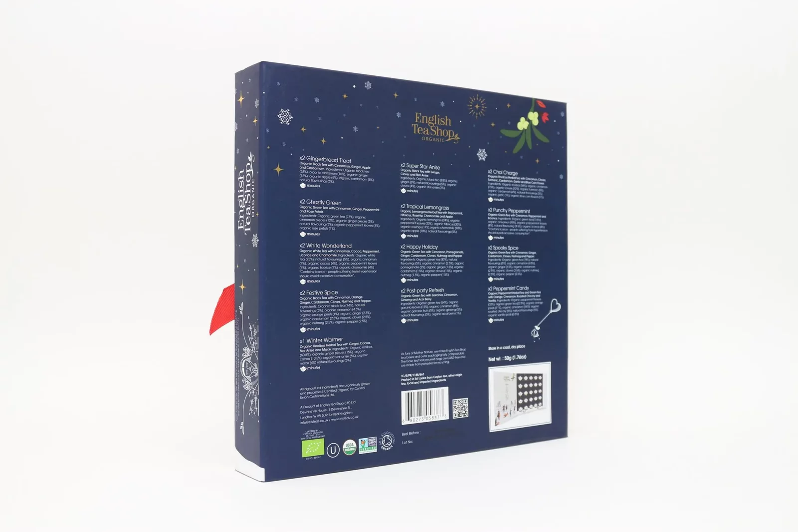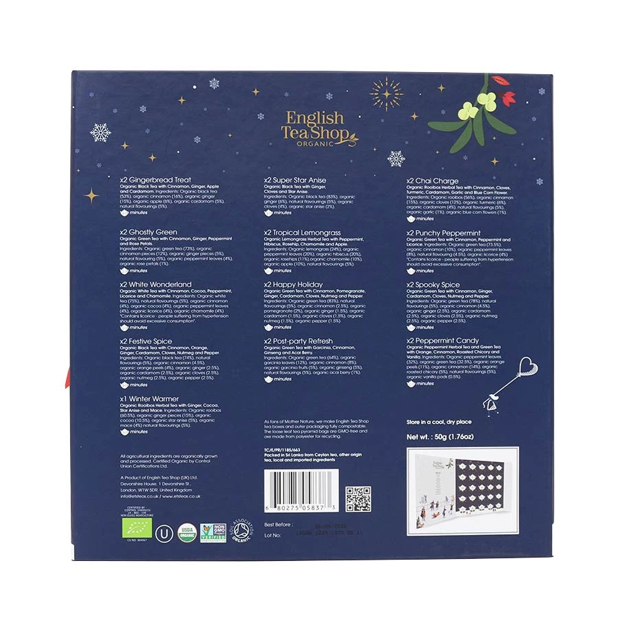English Tea Shop to brytyjski producent herbat ekologicznych wytwarzanych z najwyższej jakości liści pozyskiwanych od rolników na całym świecie. Wszystkie herbaty powstają w fabryce na Sri Lance, w której do tej pory opracowano ponad 100 autorskich kompozycji smakowych. Marka pozostaje wierna idei zero waste, dlatego wszystkie jej produkty pakowane są w biodegradowalne pudełka podlegające w stu procentach recyklingowi. Ich kolorystyka różni się w zależności od smaku danej herbaty.