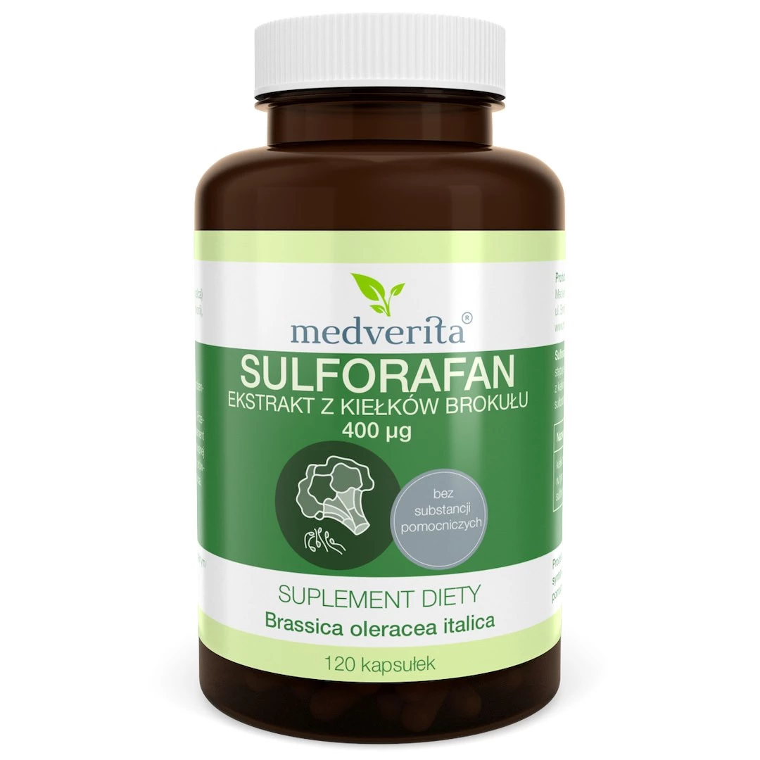 - Medverita Sulforafan od Medverita to suplement diety w kapsułkach zawierający ekstrakt z kiełków brokułu (Brassica oleracea italica) standaryzowany na 0,5% sulforafanu.