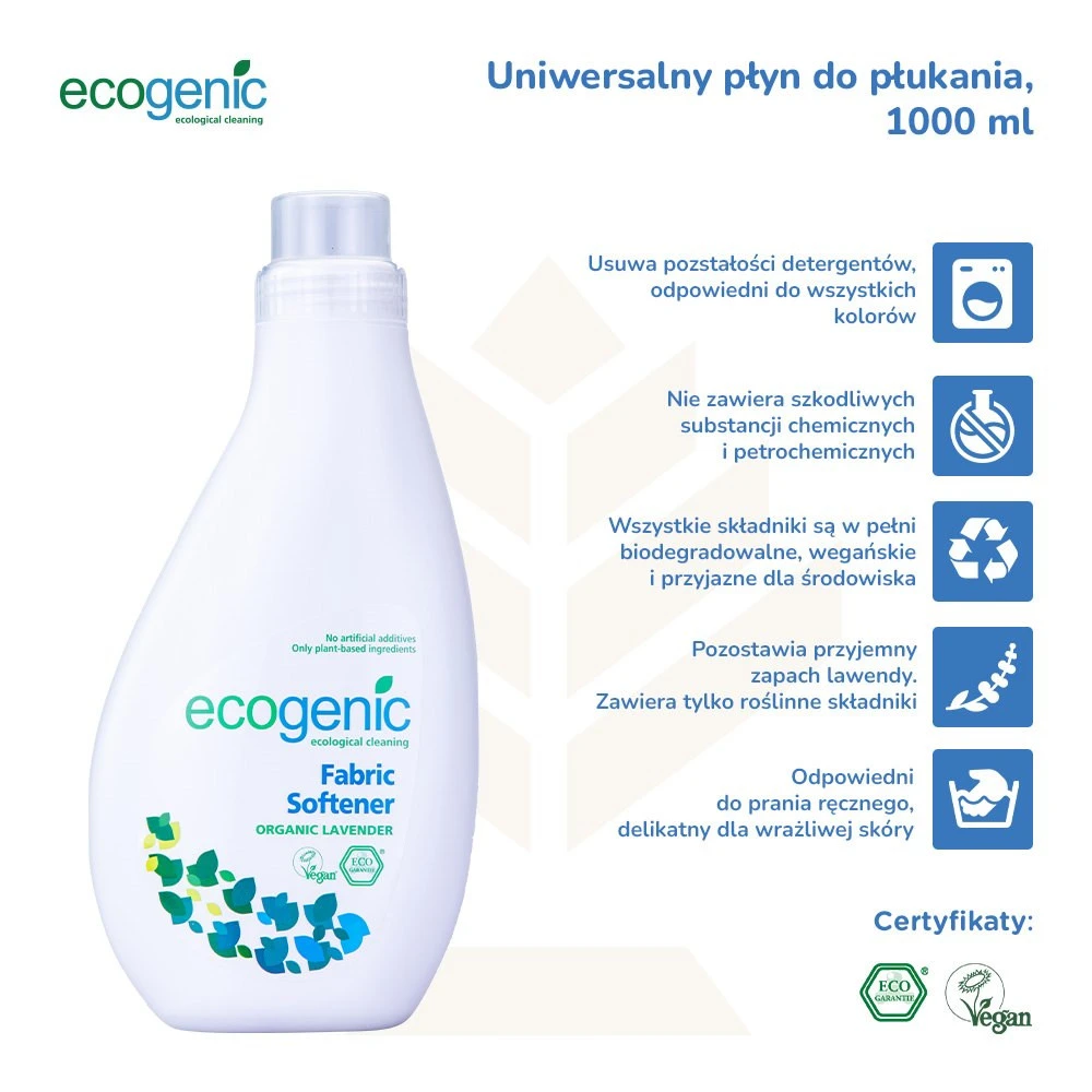 - Ecogenic Płyn do zmiękczania tkanin Eko 1000 ml Oto Lawendowy Mistrz Płukania, nasz niezawodny i ekologiczny płyn do zmiękczania tkanin o subtelnym zapachu lawendy.