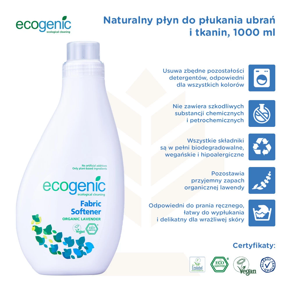 - Ecogenic Płyn do zmiękczania tkanin Eko 1000 ml Oto Lawendowy Mistrz Płukania, nasz niezawodny i ekologiczny płyn do zmiękczania tkanin o subtelnym zapachu lawendy.