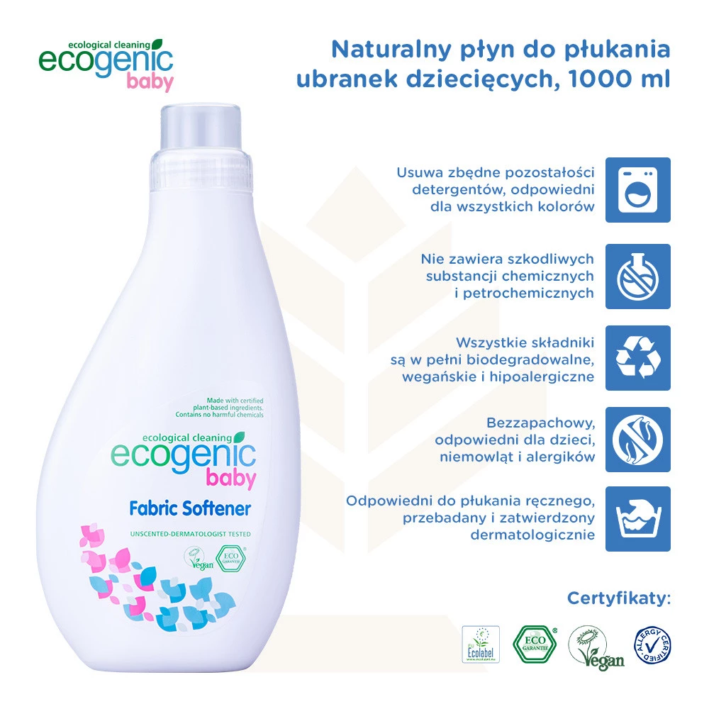 - Ecogenic Płyn do zmiękczania baby Eko 1000 ml Prezentujemy nasz ekologiczny i skuteczny płyn do zmiękczania tkanin. Hipoalergiczny i pozbawiony barwników.