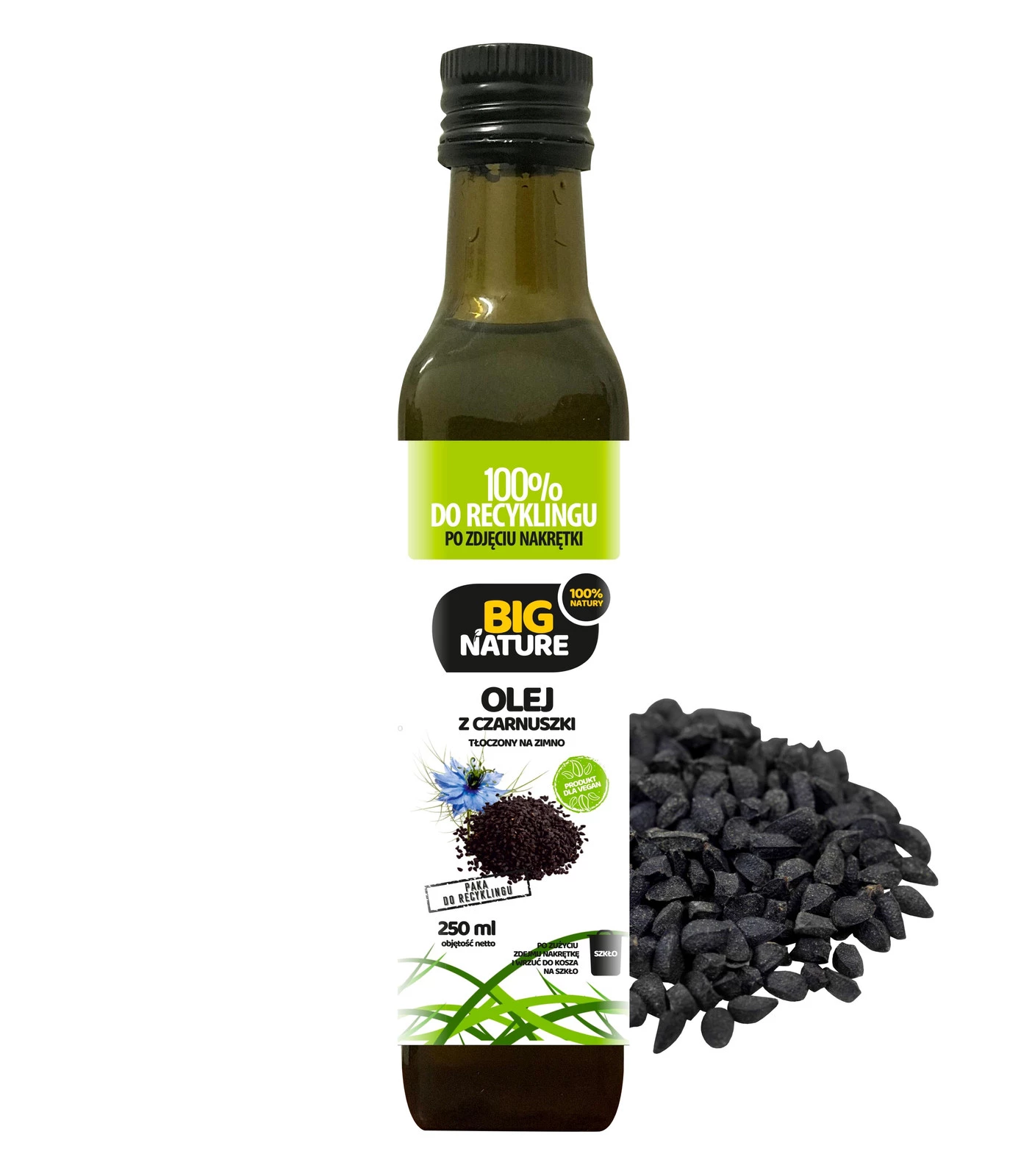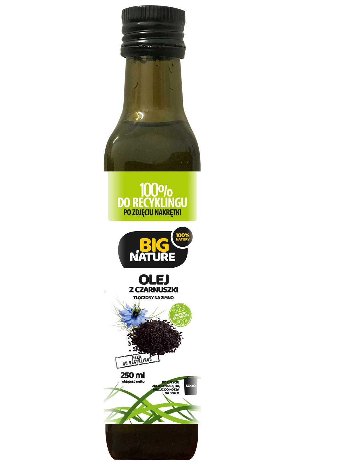 - Big Nature Olej z czarnuszki 250 ml Olej z czarnuszki posiada bardzo dużo właściwości zdrowotnych. Najwięcej składników mineralnych i witamin posiada olej z czarnuszki tłoczony na zimno.