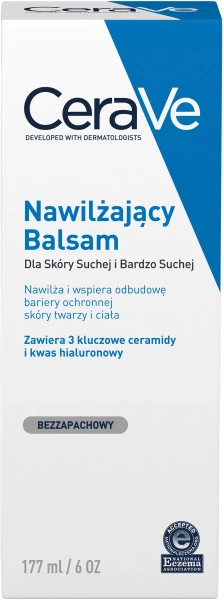 Nawilżający balsam do twarzy i ciała zawiera ceramidy i kwas hialuronowy, aby zapewnić długotrwałe nawilżenie do 48h oraz łagodzić suchą, swędzącą i wrażliwą skórę. Pomaga odbudować naturalną barierę ochronną skóry już od pierwszego zastosowania.Posiada opatentowaną technologię MVE, która stopniowo uwalnia składniki nawilżające przez całą dobę. Twoje ciało pozostaje idealnie nawilżone od momentu nałożenia balsamu, aż do kolejnego prysznica.Warto stosować przy skórze: suchej i bardzo suchej, trądzikowej; atopowej; z łuszczycą.Odpowiedni od 2 miesiąca życia.Odpowiedni dla suchej i bardzo suchej skóry twarzy oraz ciała.Niekomedogenny, bez substancji zapachowych.Bogata, odżywcza konsystencja.Rekomendowany przez National Eczema Association.CERAVE to kompozycja trzech ceramidów o budowie identycznej z ceramidami zawartymi w skórze: ceramid 1, ceramid 3, ceramid 6-II, a takze cholesterolu, kwasów tłuszczowych i fitosfingozyny. Składniki te wykazują działanie synergiczne w odbudowie bariery ochronnej skóry.Technologia (MVE) (Multivesicular Emulsion Technology) umożliwia stabilne w czasie uwalnianie składników aktywnych, w tym niezbędnych ceramidów, aby pomóc w odbudowaniu bariery ochronnej skóry, dzięki czemu pozostaje ona nawilżona na dłużej.2021500 - INGREDIENTS: AQUA / WATER • GLYCERIN • CETEARYL ALCOHOL • CAPRYLIC/CAPRIC TRIGLYCERIDE • CETYL ALCOHOL • CETEARETH-20 • PETROLATUM • POTASSIUM PHOSPHATE • CERAMIDE NP • CERAMIDE AP • CERAMIDE EOP • CARBOMER • DIMETHICONE • BEHENTRIMONIUM METHOSULFATE • SODIUM LAUROYL LACTYLATE • SODIUM HYALURONATE • CHOLESTEROL • PHENOXYETHANOL • DISODIUM EDTA • DIPOTASSIUM PHOSPHATE • TOCOPHEROL • PHYTOSPHINGOSINE • XANTHAN GUM • ETHYLHEXYLGLYCERIN (F.I.L. D213768/2).