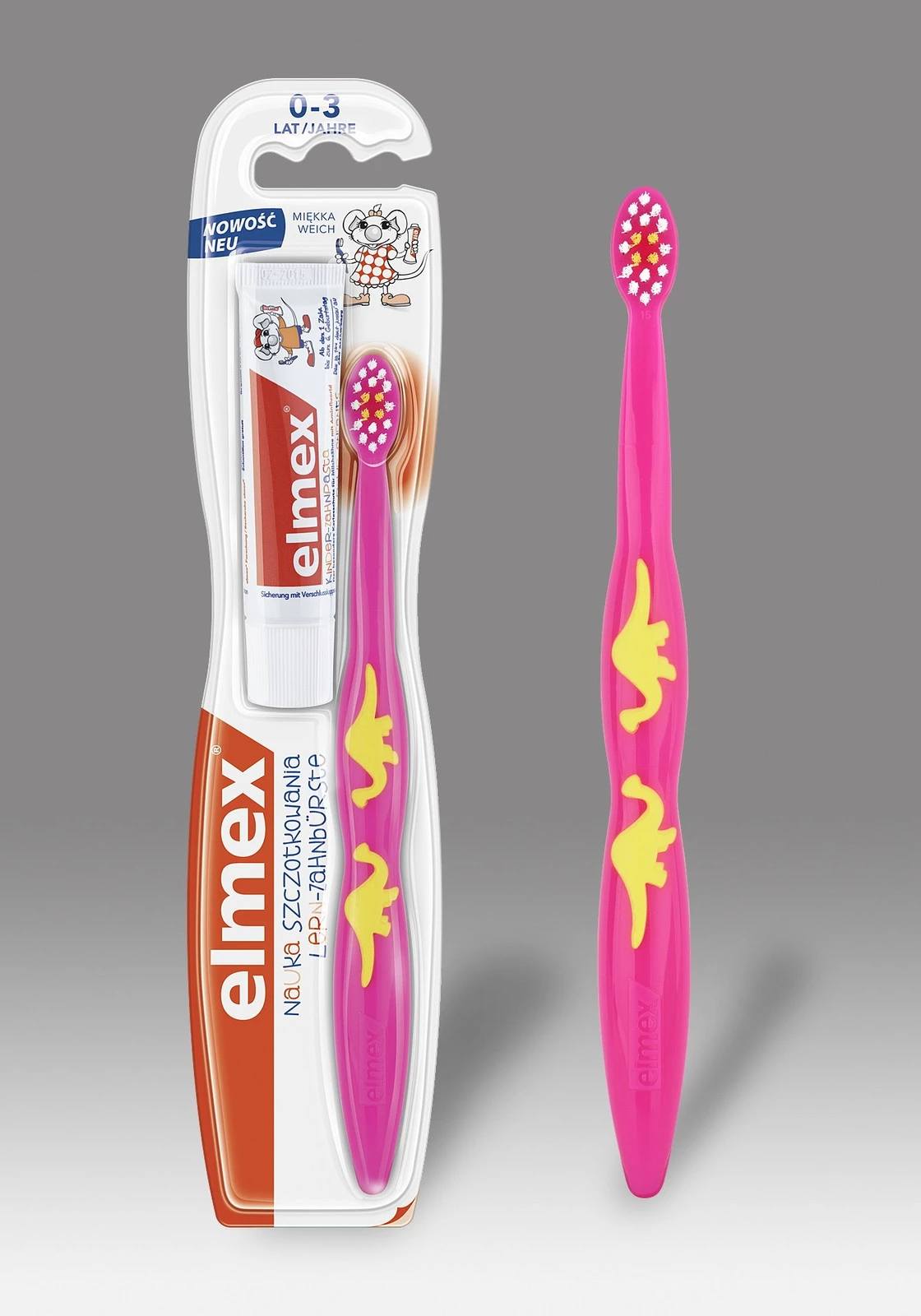 - Elmex szczoteczka dla dzieci 0-3 lata miękka została zaprojektowana z myślą o codziennej pielęgnacji jamy ustnej najmłodszych dzieci. Ma niewielką główkę wyposażoną w bardzo miękkie włosie oraz ergonomiczną, łatwą w trzymaniu rączkę.