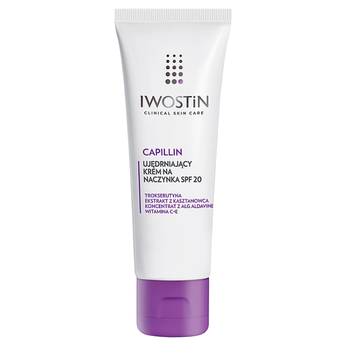 Iwostin Capillin Ujędrniający krem na naczynka SPF 20 został stworzony z myślą o codziennej pielęgnacji dojrzałej skóry naczynkowej. Odpowiada na jej szczególne potrzeby: widocznie zmniejsza widoczność popękanych naczynek i skłonność do ich powstawania, optycznie koryguje zaczerwienienia oraz wyrównuje koloryt Wygładza i skutecznie ujędrnia skórę Pozostawia skórę nawilżoną i złagodzoną. Innowacyjna formuła: - Trokserutyna i ekstrakt z kasztanowca zmniejszają widoczność naczynek - Koncentrat z alg Aldavine 5x zmniejsza widoczność naczynek i skłonność do zaczerwienień - Witamina C+E wykazują działanie antyoksydacyjne - Ekstrakt z kory dębu korkowego wygładza i ujędrnia - Olej makadamia wzmacnia barierę lipidową - Pantenol łagodzi i koi skórę - Zielony pigment maskuje zaczerwienienia - Filtry UVB/UVA chronią skórę przed szkodliwym wpływem promieniowania UV Potwierdzona skuteczność: - Już po 1 aplikacji skóra jest widocznie gładsza, a zaczerwienienia mniej widoczne. - Poprawia napięcie skóry, ujędrnia i wygładza wg 95 % badanych - Wyraźnie nawilża skórę u 100 % badanych - Zmniejsza skłonność do pękania naczynek wg 85 % - Chroni przed promieniowaniem UV, które jest jednym z czynników zaostrzających zmiany naczyniowe Formuła bogata w starannie dobrane składniki Skuteczność potwierdzona klinicznie.