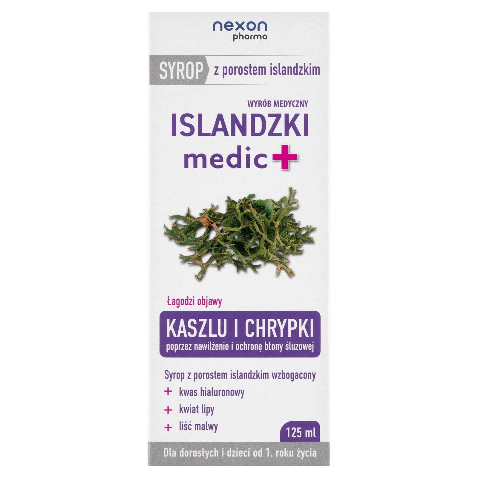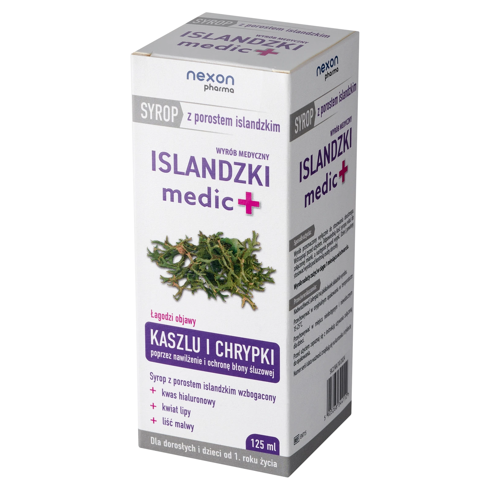 Islandzki medic+ to wyrób medyczny w formie syropu przeznaczony do nawilżania i ochrony błony śluzowej jamy ustnej, gardła, krtani oraz strun głosowych. Powleka i nawilża śluzówkę, łagodząc suchość, pieczenie, drapanie oraz ból gardła, szczególnie odczuwany przy przełykaniu. Produkt pomaga także w łagodzeniu suchego kaszlu i chrypki.