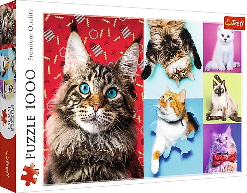 Puzzle Wesołe koty składające się z 1000 elementów przedstawiające kolaż zdjęć uroczych kotów, różnych ras. Po ułożeniu powstanie obrazek