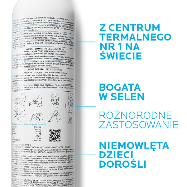 - Woda termalna z La Roche-Posay o kojących właściwościach specjalnie dla skóry podrażnionej i wysuszonej. Bogaty kompleks zanurzonych w niej składników naturalnych takich, jak sole mineralne i oligoelementy, wpływa pozytywnie na jakość i kondycję cery.