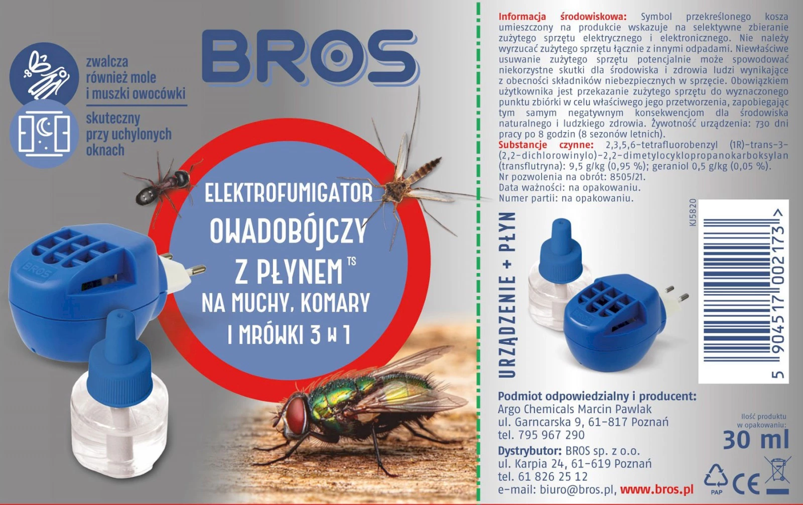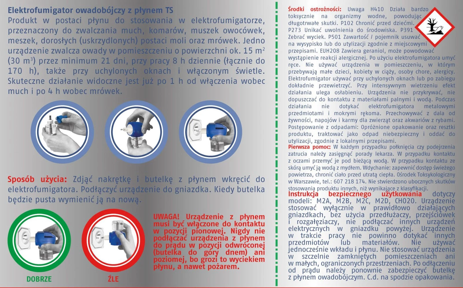 - Elektrofumigator z płynem o szerokim spektrum działania, do zwalczania much, komarów i mrówek.