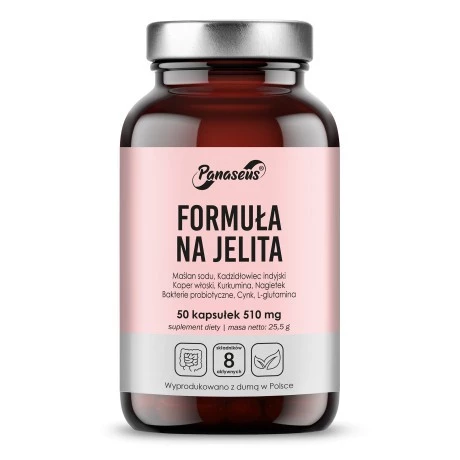 Suplement diety Panaseus Formuła na jelita to wysokiej jakości produkt, który zawiera kompozycję ekstraktów roślinnych, minerałów, aminokwasów i związków organicznych. Wyróżnia się prostym, bezpiecznym składem oraz wygodną do stosowania formą kapsułek. Jest odpowiedni dla wegan i wegetarian.