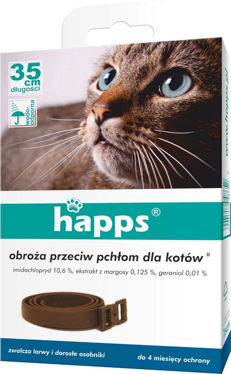 Produkty marki BROS towarzyszą już od wielu lat. Asortyment produktów został wzbogacony o produkty marki HAPPS, ułatwiające dbanie o zdrowie i higienę pupili. Bezzapachowa obroża do zwalczania pcheł u kotów. Eliminuje osobniki dorosłe, larwy i jaja pasożytów. Przerywa ich cykl rozwojowy, nie dopuszczając do przekształcenia w gryzącą postać dorosłą. Działa przeciwpchelnie już po 6 - 8 godzinach od założenia, a jej skuteczność utrzymuje się aż do 8 miesięcy. Obroża jest odporna na wodę, a wygodne zapięcie umożliwia regulowanie jej długości. Ma 35 cm długości.