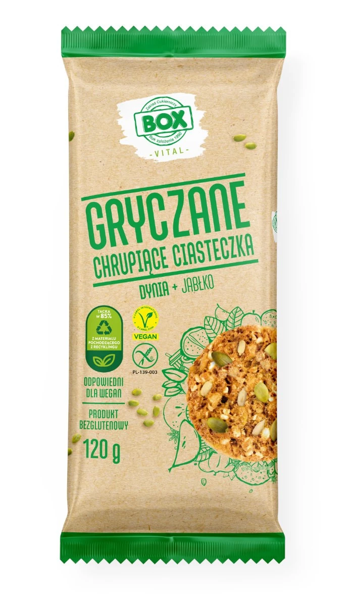 Delikatne gryczane ciasteczko z suszonym jabłkiem i ziarnami stanowi zdrową i pyszną przekąskę dla każdego, bogatą w witaminy, minerały oraz błonnik. Na uwagę zasługuje fakt że nie zawiera laktozy ani glutenu, głównych alergenów spożywczych. Jest przeznaczony również dla wegan i wegetarian.