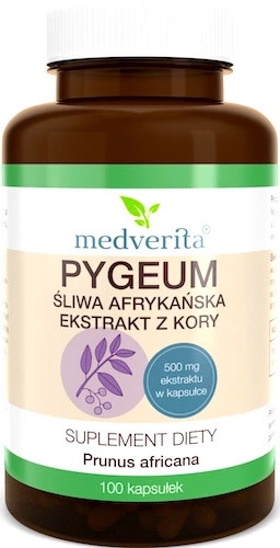 Medverita Pygeum Śliwa Afrykańska ekstrakt 100 kapsułek to suplement diety zawierający 100 kapsułek, każda z nich dostarczająca ekstrakt z kory śliwy afrykańskiej, znanej również jako Pygeum africanum.