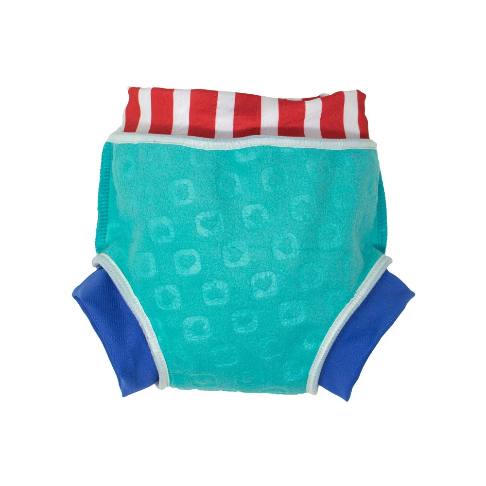 Pielucha do pływania jest wykonana ze specjalnego laminatu, który jest bardziej miękki i elastyczny niż stroje kąpielowe z neoprenu. Zewnętrzna warstwa jest odporna na plamy i zaprojektowana tak, aby utrzymać pieluszkę w idealnym stanie, podczas gdy szybko odprowadzający wilgoć polar wewnątrz zapewnia dziecku przytulność.