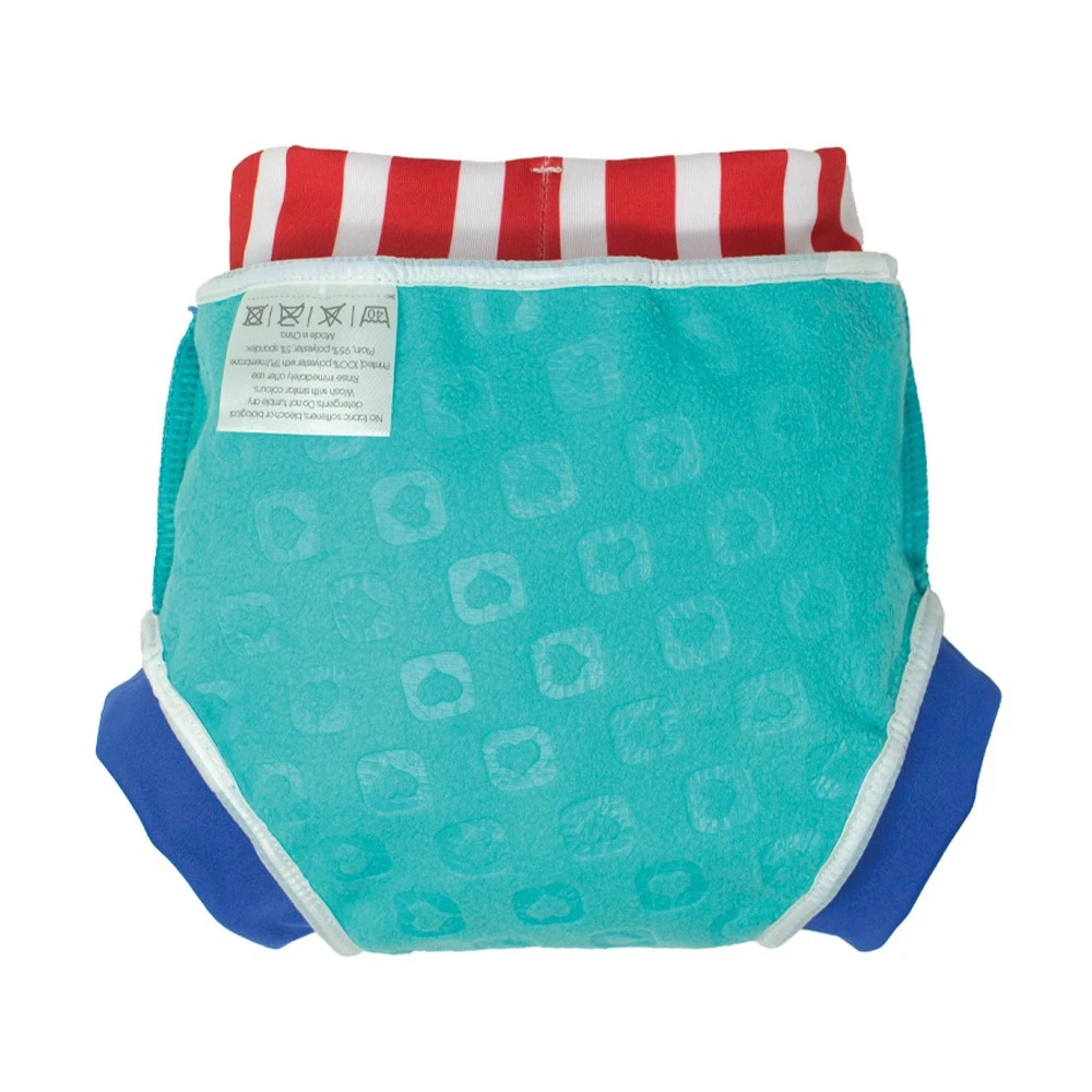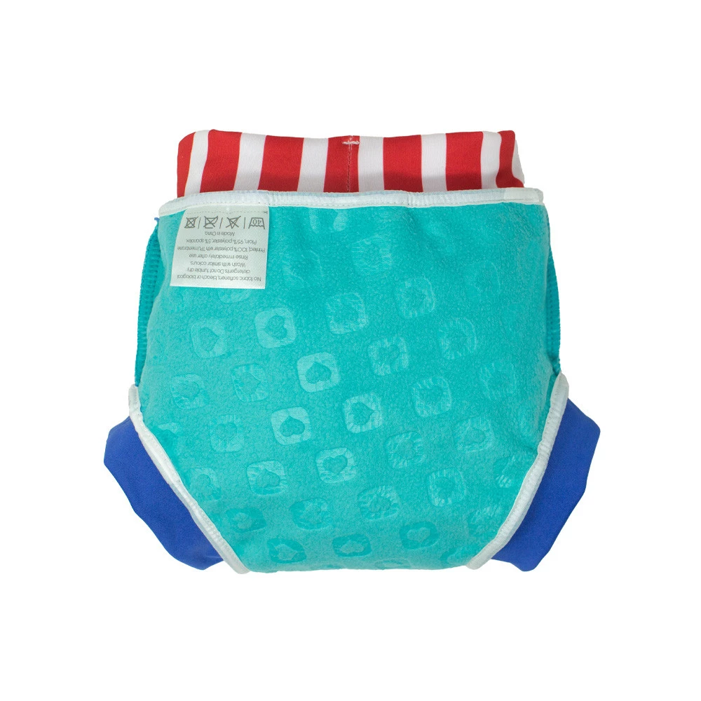 Pieluszka do pływania wykonana jest ze specjalnego, miękkiego i elastycznego laminatu z odporną na plamy warstwą zewnętrzną, dzięki której pieluszka wygląda świetnie, i miękkim polarem wewnątrz, aby maluchy czuły się komfortowo w wodzie.