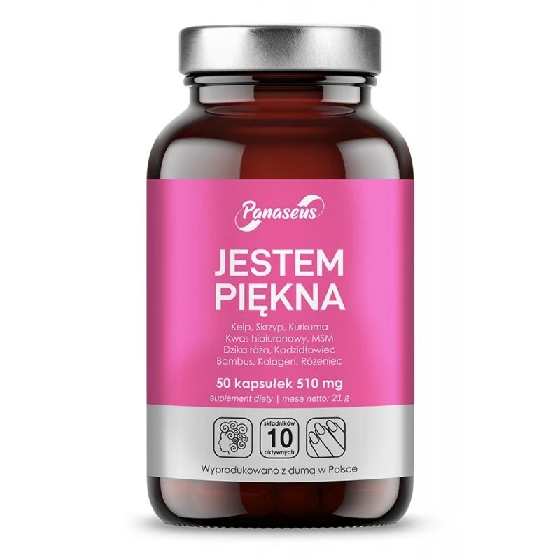 Panaseus Jestem Piękna to kompleksowy suplement diety stworzony z myślą o kobietach, które chcą zadbać o swoją urodę od wewnątrz. Zawiera aż 10 składników aktywnych, w tym ekstrakty roślinne, kolagen, kwas hialuronowy, witaminę C oraz minerały wspierające kondycję skóry, włosów i paznokci. Formuła została opracowana tak, by działać synergicznie – wspiera naturalną produkcję kolagenu, poprawia elastyczność skóry, wzmacnia włosy i wspomaga ich wzrost.