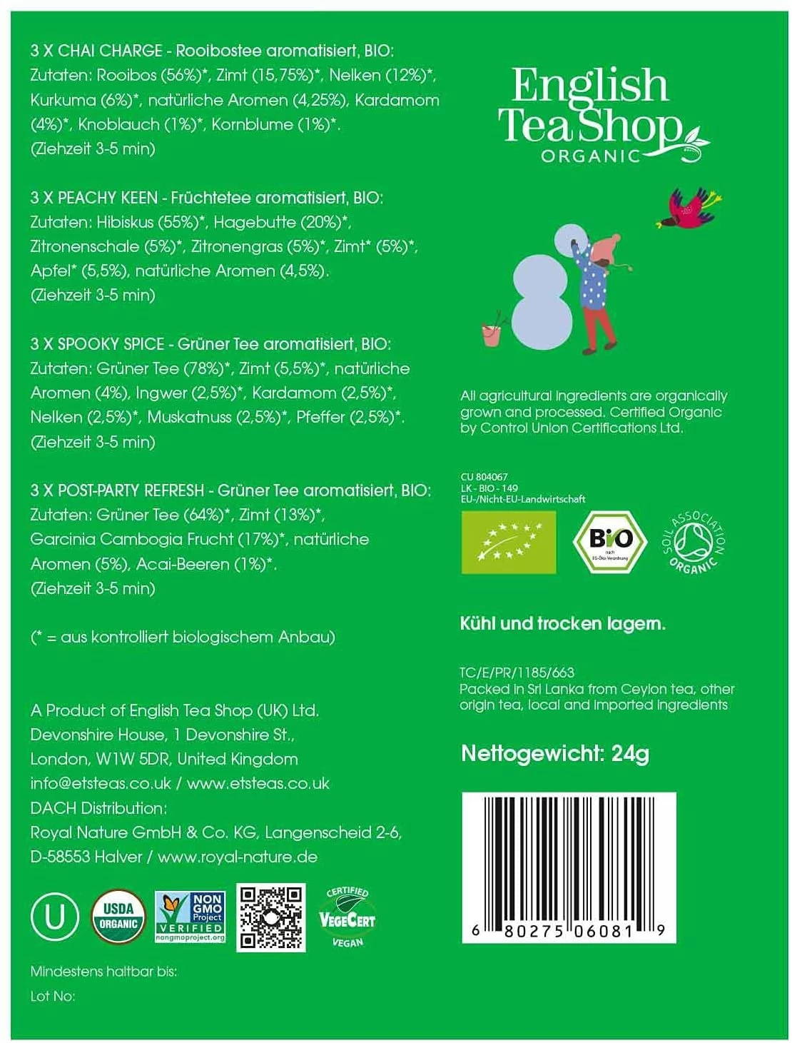 Składniki: Ekologiczna herbata zielona (78%), ekologiczny cynamon (5,5%), naturalne aromaty (4%), ekologiczny imbir (2,5%), ekologiczny kardamon (2,5%), ekologiczne goździki (2,5%), ekologiczna gałka muszkatołowa (2,5%), ekologiczny pieprz (2,5%).