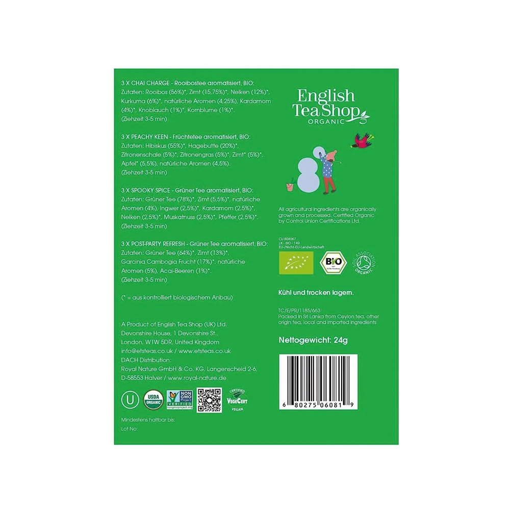 English Tea Shop to brytyjski producent herbat ekologicznych wytwarzanych z najwyższej jakości liści pozyskiwanych od rolników na całym świecie. Wszystkie herbaty powstają w fabryce na Sri Lance, w której do tej pory opracowano ponad 100 autorskich kompozycji smakowych. Marka pozostaje wierna idei zero waste, dlatego wszystkie jej produkty pakowane są w biodegradowalne pudełka podlegające w stu procentach recyklingowi. Ich kolorystyka różni się w zależności od smaku danej herbaty.