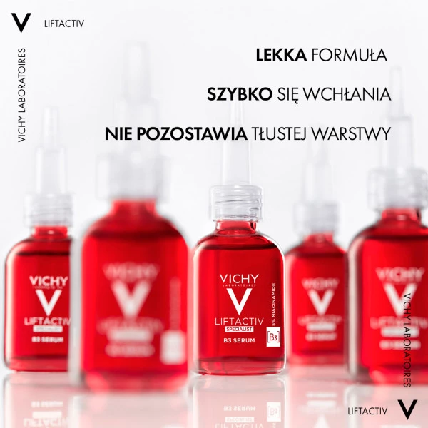 - LIFTACTIV B3 SERUM z niacynamidem i kwasem glikolowym skutecznie redukuje przebarwienia i zmarszczki.