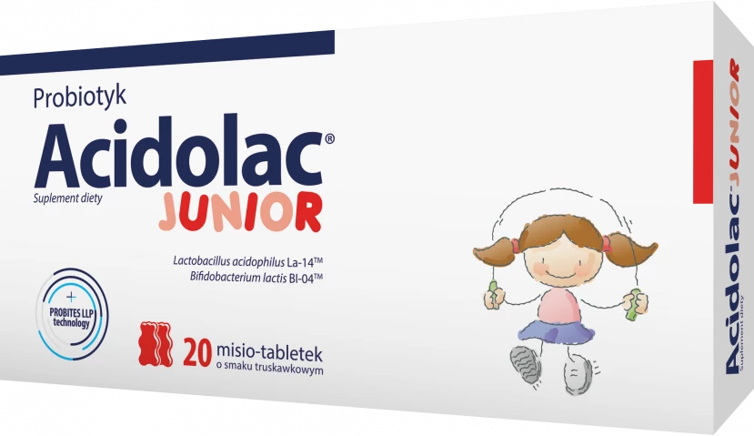 Acidolac® Junior to preparat łączący w składzie szczepy bakterii Lactobacillus acidophilus La-14TM i Bifidobacterium lactis BI-04TM, fruktooligosacharydy (FOS) oraz witaminę B6, która wspomaga prawidłowe funkcjonowanie układu odpornościowego.