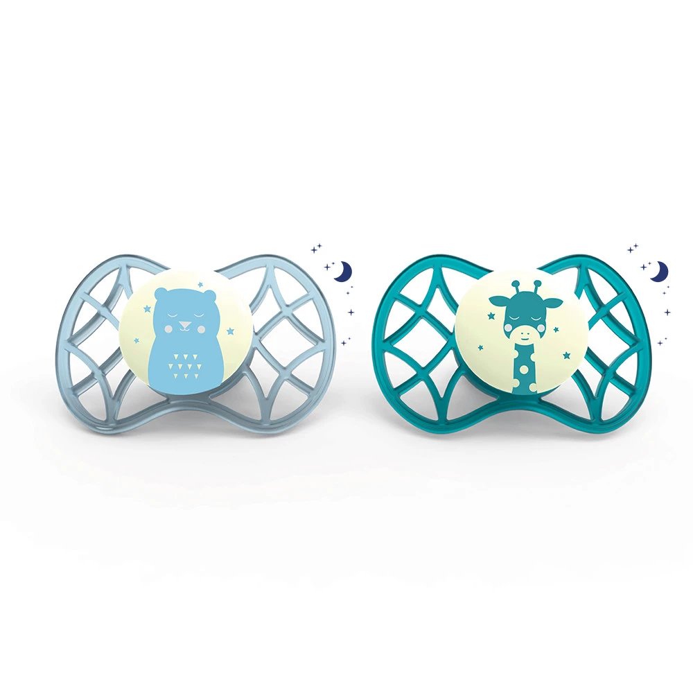 Specjalnie zaprojektowany kształt smoczka sprzyja prawidłowemu rozwojowi jamy ustnej, zmniejszając ryzyko niewspółosiowości zębów i uszkodzenia podniebienia. Cienki kształt u nasady wspomaga naturalne zamykanie ust zapewniając prawidłowe ułożenie języka i naturalny rozwój podniebienia.