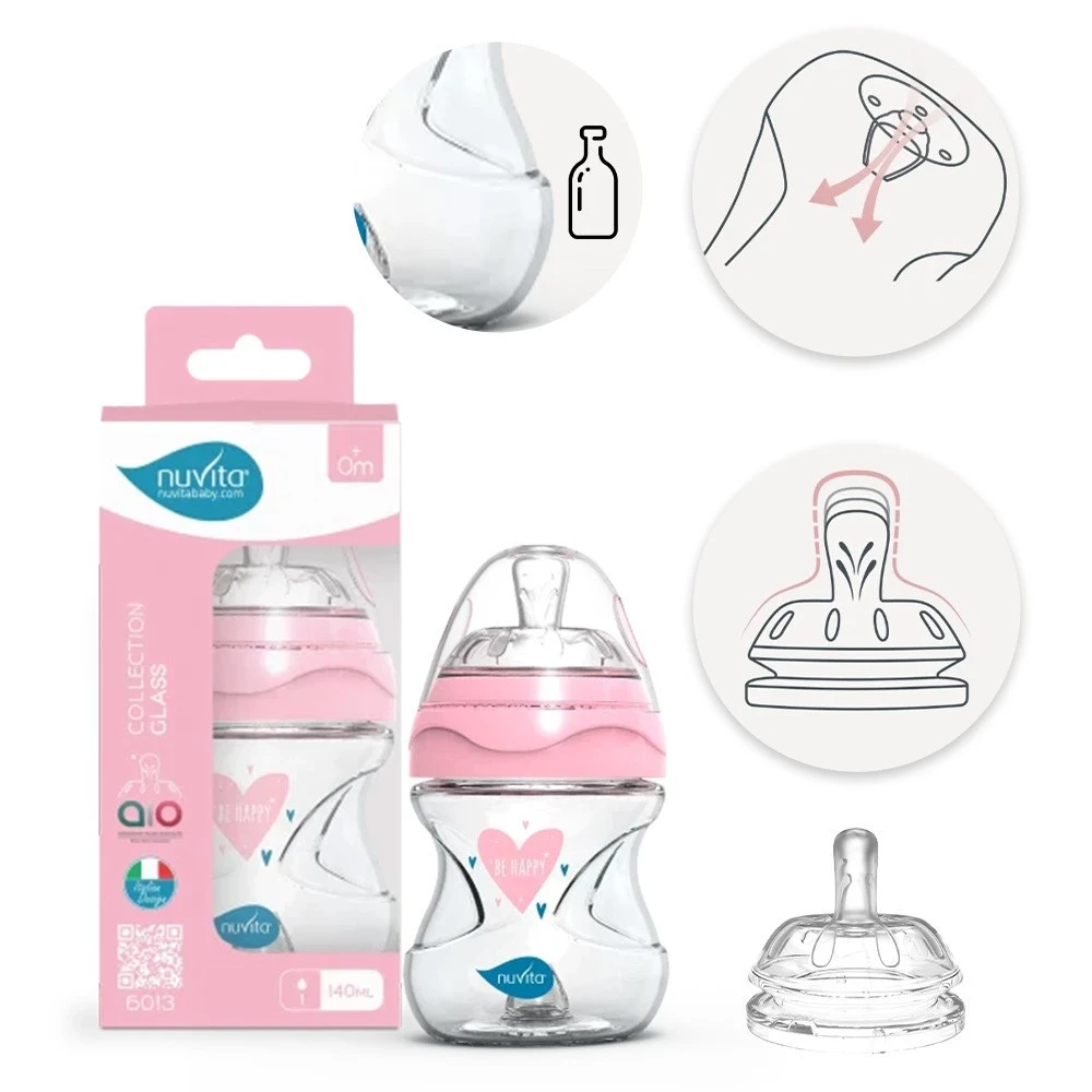 Collection Glass by Nuvita to wyjątkowa butelka dla niemowląt, która łączy w sobie wszystkie zalety butelki szklanej ze skutecznością antykolkowego zaworu umieszczonego na dnie butelki. Gwarantuje maksymalną skuteczność w zmniejszaniu ryzyka kolki.
